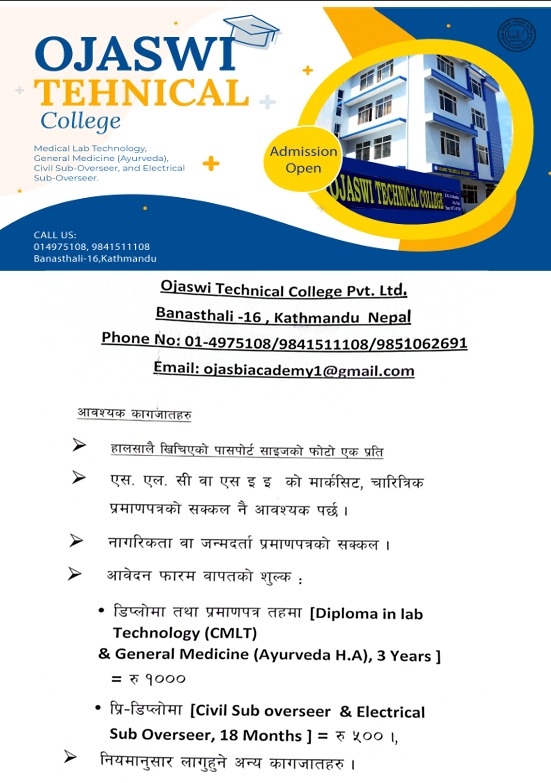 Ojaswi Technical College is in fact not a new concept. OJASBI TECHNICAL COLLEGE is a well known institute with a different and solid vision to improve the quality in educational sector and employment established in prime and centrally located area managed by a group of Educationists,Scholars,Health Professionals & social Scientists committed to build the sound , efficient and productive academic institution for quality education through innovative and experiential learning methods together with highly qualified and experienced professors,teachers ,lecturers and with the efficient staff The mission of the Ojaswi Technical College Kathmandu shall be to promote socially responsible,affordable,mass effective and sustainable market driven forms of technical education for local and global market.
